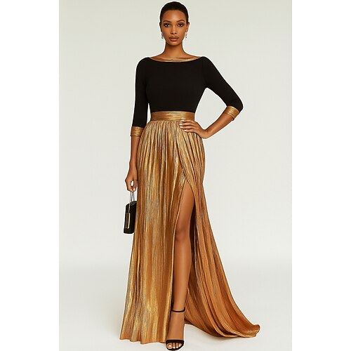 Linea ad A Lunghezza al pavimento Abiti da Ballo Abito da Sera Da principessa Abito formale Elegante Monocolore Setoso Manica Lunga Scollo a Barca Matrimonio Formale Abito Champagne per la Madre