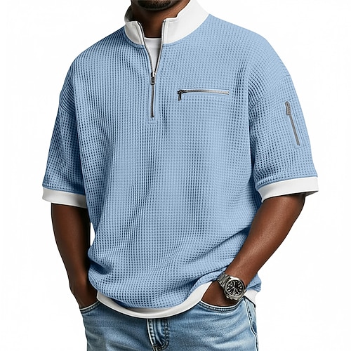 Per uomo Maglietta Waffle Maglietta Manica Corta Maglione Mezza zip Estate Tinta unica Moda Designer Confortevole Patchwork Blocco di colore Tasca con cerniera Casuale Quotidiano All'aperto Blu