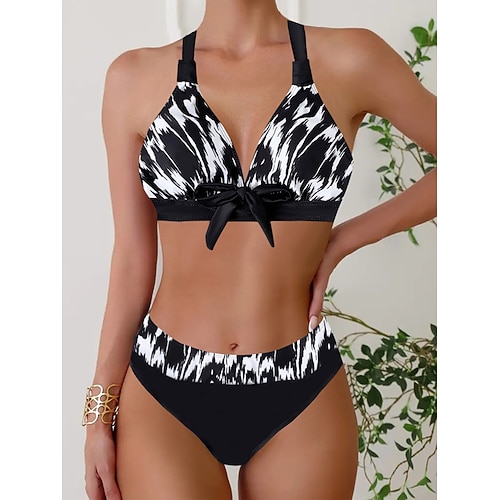 Costume da bagno bikini da donna a 2 pezzi con controllo della pancia alto e schiena scoperta per vacanze al mare colletto a halter e senza maniche