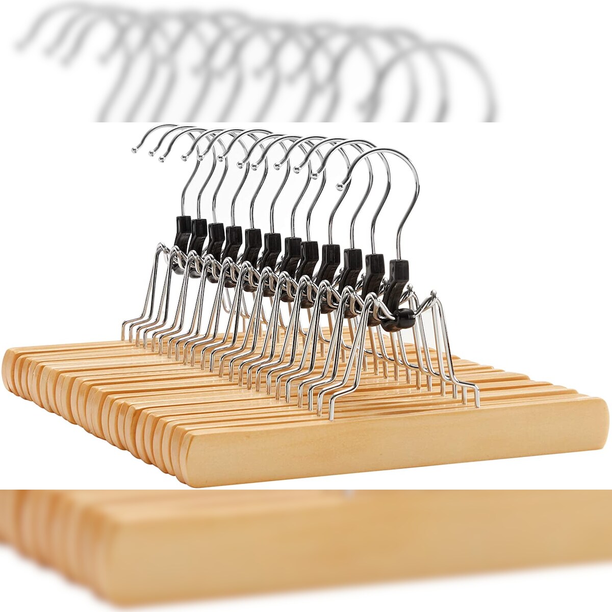 som Hosenspanner, 12 Stück, Kleiderbügel aus Holz mit Filzeinlage rutschfest mit 360 Grad drehbaren Haken, Hosenklammer, Hosenhalter, Natur