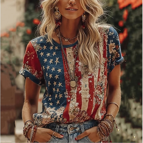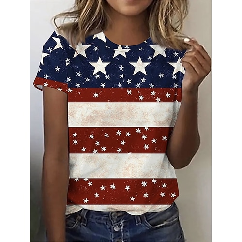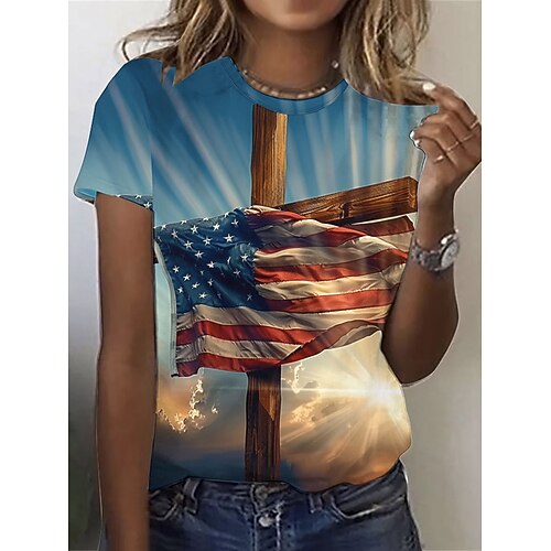 Giorno dell'Indipendenza Americana Per donna Maglietta Stampato Grafico Bandiera Elegante Classico Casual Manica Corta Girocollo Top Regolari Quotidiano Blu Bianco Rosso Estate Primavera