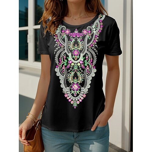 Per donna maglietta Fantasia geometrica Piante Informale Manica corta Rotonda Top regolari Giornaliero Stampa Rosso Estate
