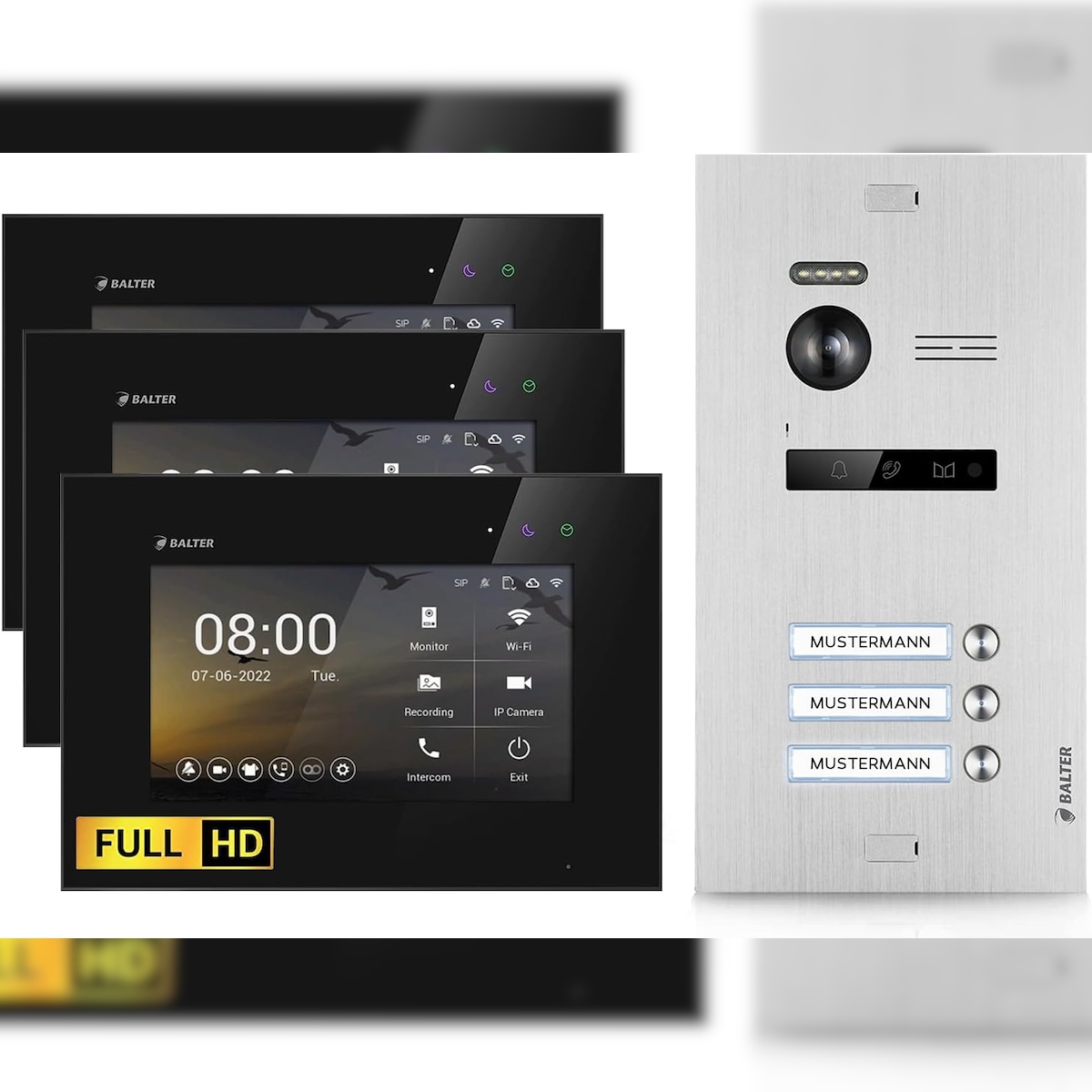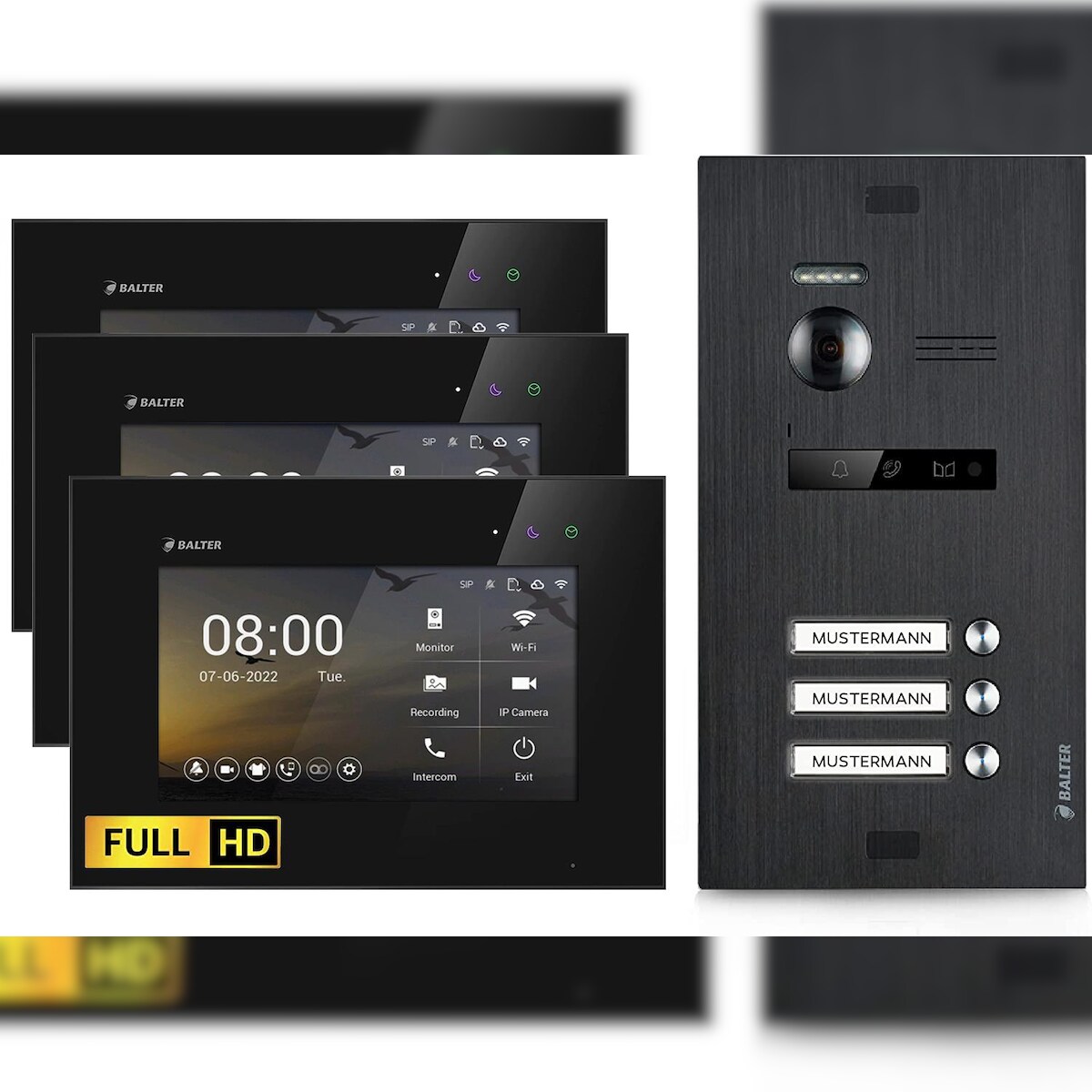 HD Video Türsprechanlage für 3 Familienhaus, 3x Monitor, Balter EVO HD Black