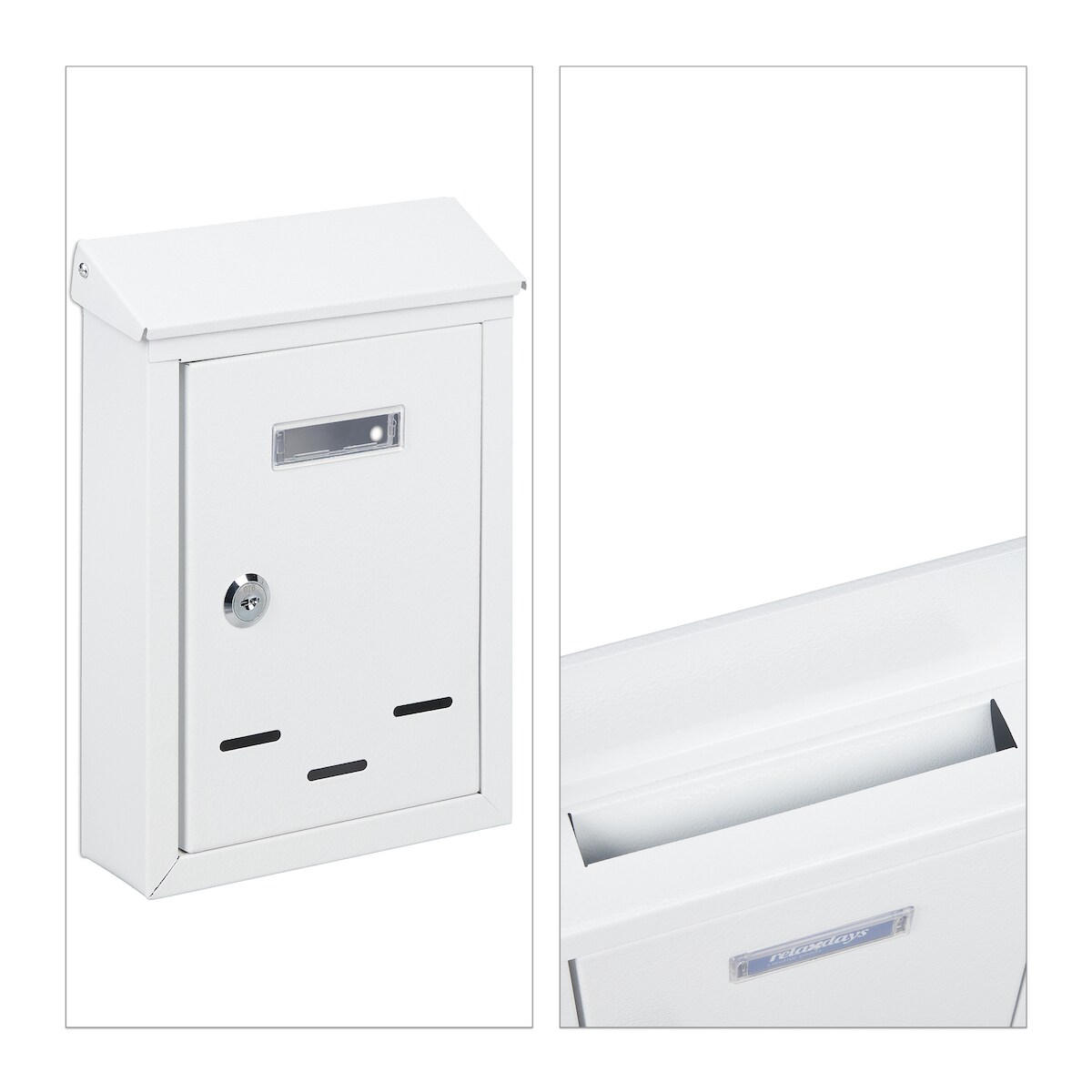 Relaxdays Briefkasten mit Namensschild, aus Metall, mit 2 Schlüsseln, Postkasten schmal, HxBxT: 26,5 x 19 x 6,5 cm, weiß
