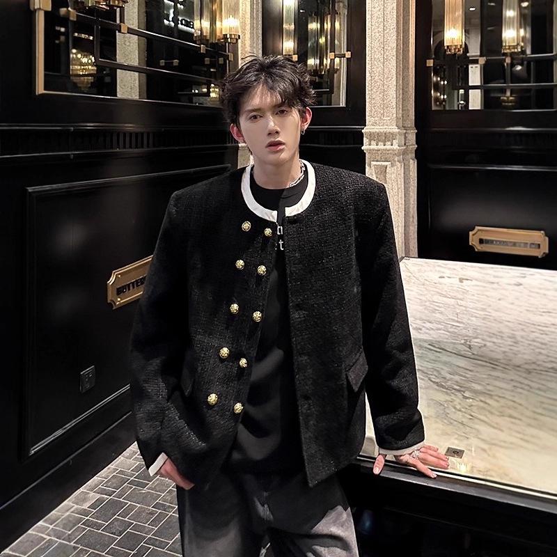 Men’s Luxury French Chic Metal Double-Breasted Wool Jacket in Black and White cm black