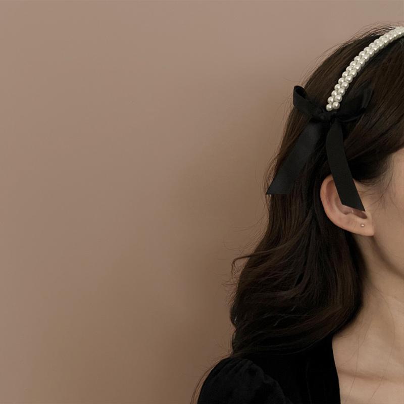 French Pearl Bow Headband Black High End Retro Hepburn Headband for Women