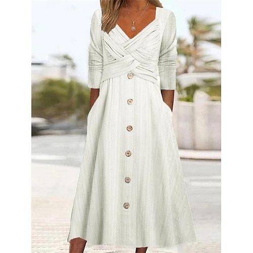 Per donna Abito Lungo Maxi Abito Misto lino Abito Bianco Abiti in cotone e lino Vestito Casual Moda Classico Quotidiano Uscire Vestibilità regolare Semplice Manica Lunga Scollo a V Blu Bianco Cachi