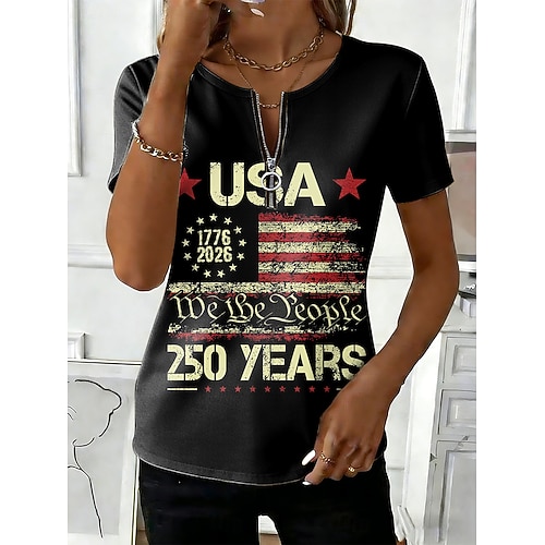 Giorno dell'Indipendenza Americana Per donna Maglietta Cerniera Grafico Bandiera Americana Elegante Classico Casual Manica Corta Girocollo Top Regolari Quotidiano Weekend Nero Bianco Rosso Estate