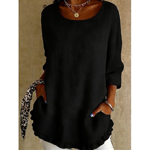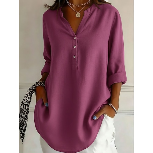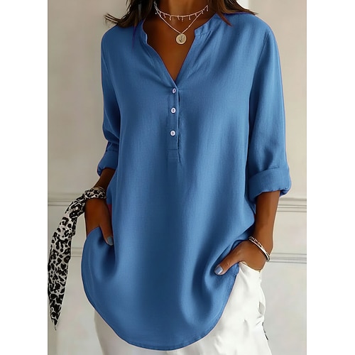 Per donna Camicia Camicie di cotone e lino Camicia di lino Semplice Quotidiano Elegante Essenziale Manica 3/4 Manica a Lanterna Scollo a V Top Regolari Quotidiano Lavoro Ferie Blu Nero Cachi