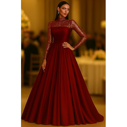 Linea ad A Lunghezza al pavimento Abito da Sera Da principessa Abito formale Elegante Scintillante Setoso Manica Lunga Girocollo Matrimonio Formale Tasca Con Paillettes con Glitter
