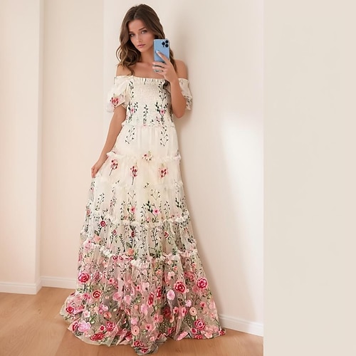 Linea ad A Lunghezza al pavimento Abito da Sera Elegante Floreale Manica Corta Senza Spalle Festa in giardino Matrimonio Tasca Raso con Stampa floreale