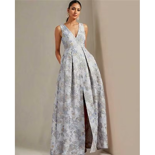 Linea ad A Lunghezza al pavimento Abito Formale Abito da Sera Da principessa Abito formale Elegante Spacco Alto Senza Maniche Scollo a V Festa in giardino Matrimonio Jacquard con Spacco