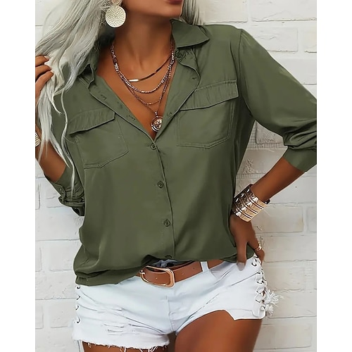 Per donna Blusa Top Eleganti Tinta unica Semplice Elegante Vintage Signore Manica Lunga Colletto a Camicia Top Regolari Lavoro Quotidiano Ferie Arricciato Tasca Bottoni Verde primavera Nero Rosa