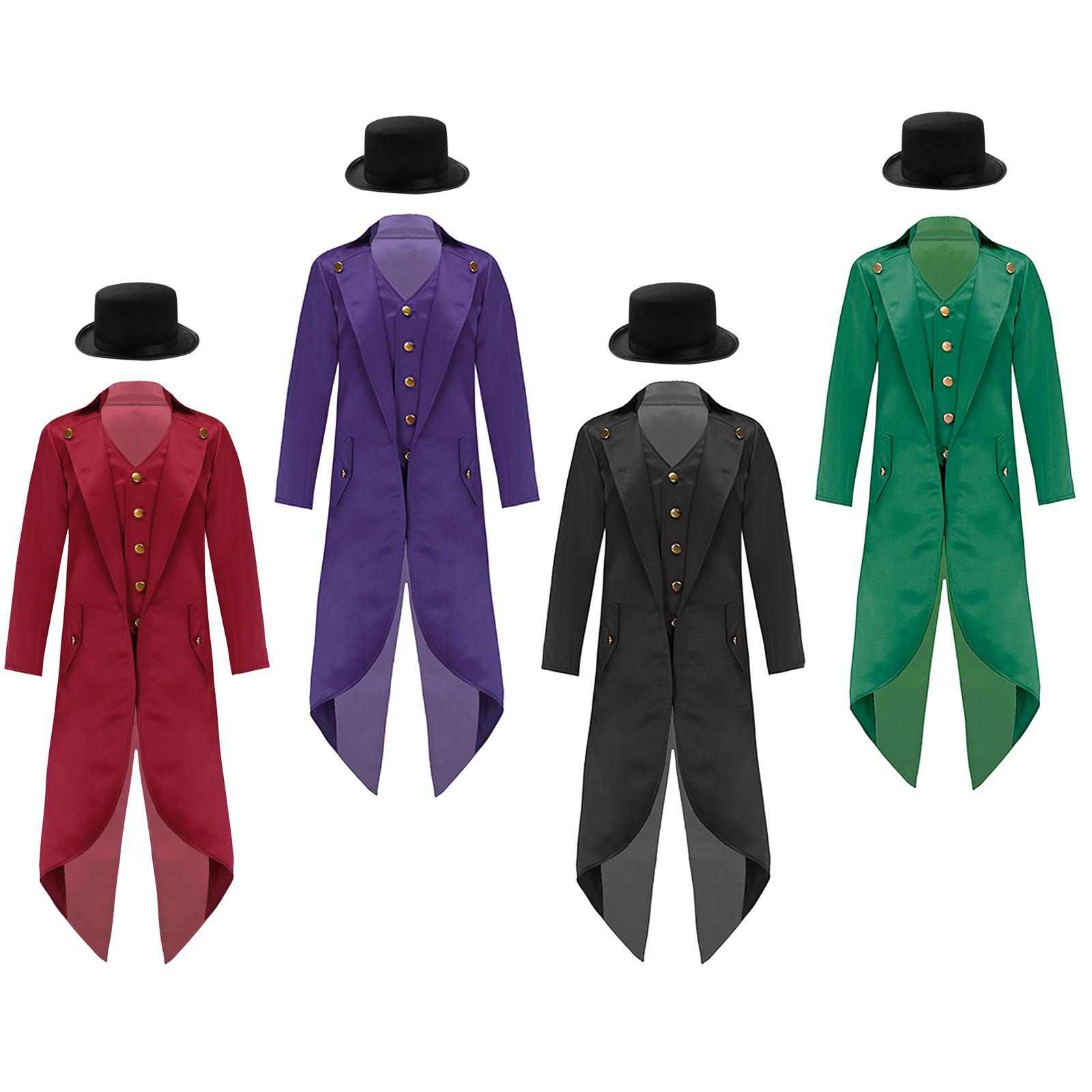 Kids Victorian Costume Retro Renaissance Tailcoat Jacket Gold Buttons Felt Hat Magician Ringmaster Party Outfit cm black