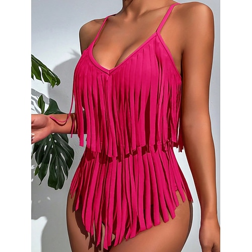 Costume da bagno intero da donna monokini controllo pancia vita alta Slim frange senza schiena per vacanze al mare colore solido scollo a V senza maniche