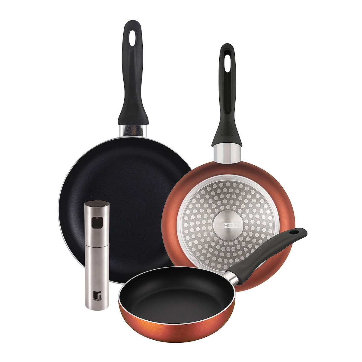 BERGNER - Set aus 3 Pfannen Ø16/20/24cm aus gepresstem Aluminium in metallic-copper mit Öl-/Essigsprüher Ø4x17,5 cm aus Edelstahl