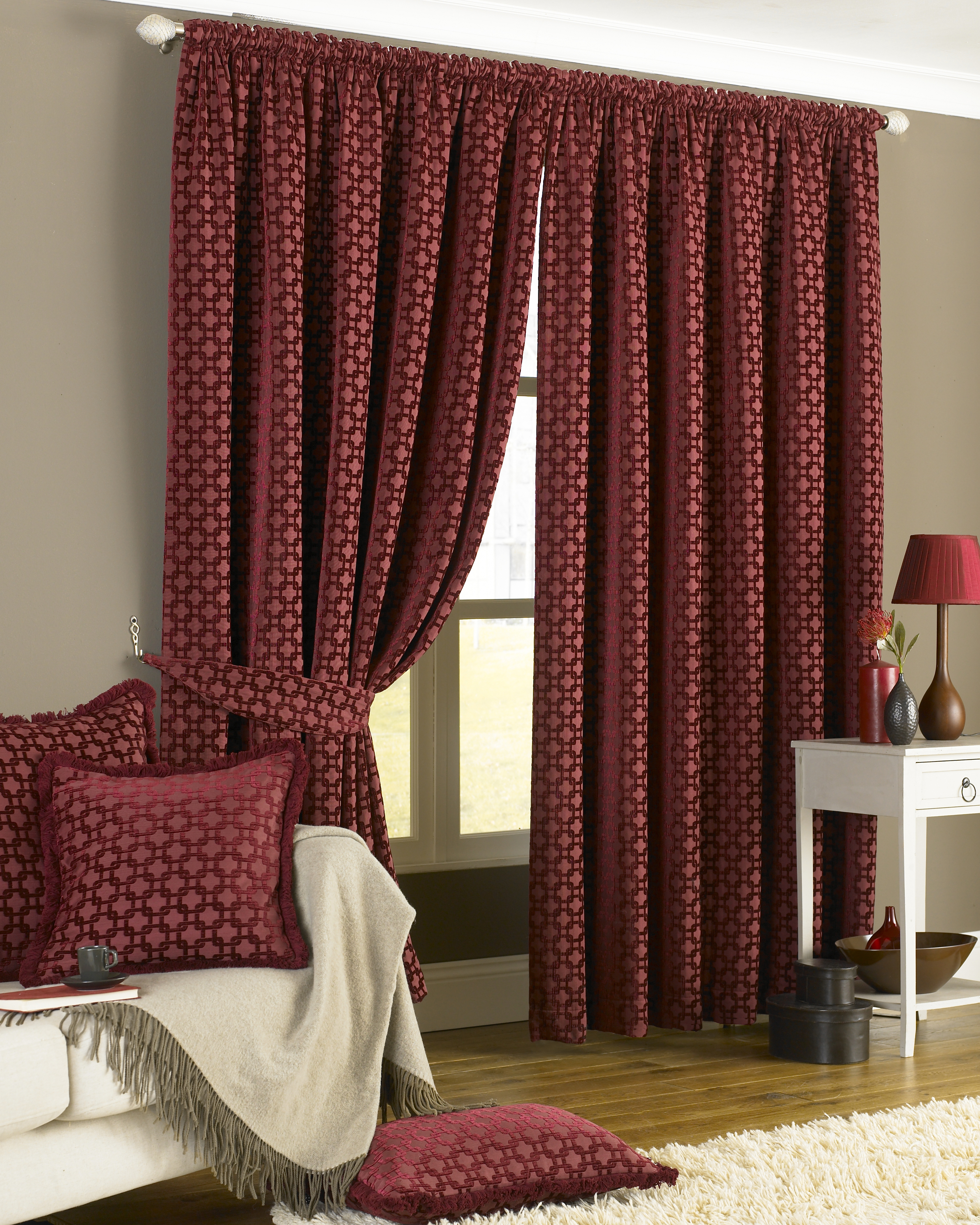 Paoletti Belmont Chenille Geometric Pencil Pleat Curtains in Claret - Burgundy - Size 229 cm x 229 cm | Paoletti Sale | Discount Designer Brands