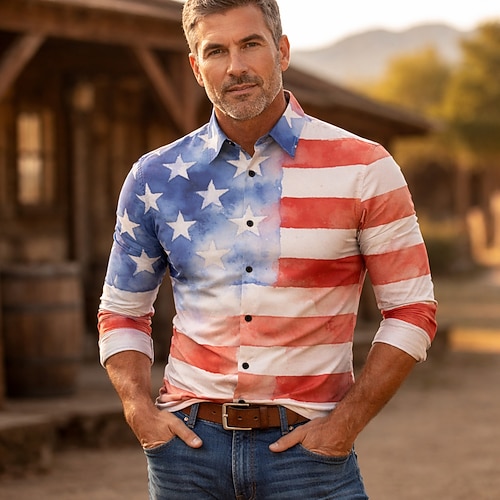 Americano 250 Retrò Vintage Anni '70 Camicia Camicia Aloha Lunghe Hippie Geometrico Etnico Costume Per uomo Mascherata 4 Luglio Feste Giorno dell'Indipendenza Semiquincentenario Adulti Camicia