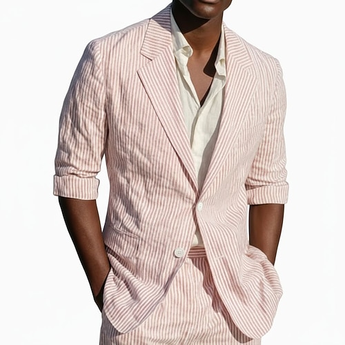 Uomo Casuale Matrimonio in Spiaggia Abiti in seersucker Bavero classico Giallo Rosa Leggero Casual A righe Vestibilità su misura 2 pezzi Monopetto Due Bottoni