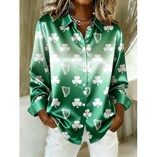 Camicia da donna per il giorno di San Patrizio con grafica trifoglio vintage elegante moderna maniche lunghe colletto top regolari quotidiani festa bianchi verdi chiaro verdi estate primavera