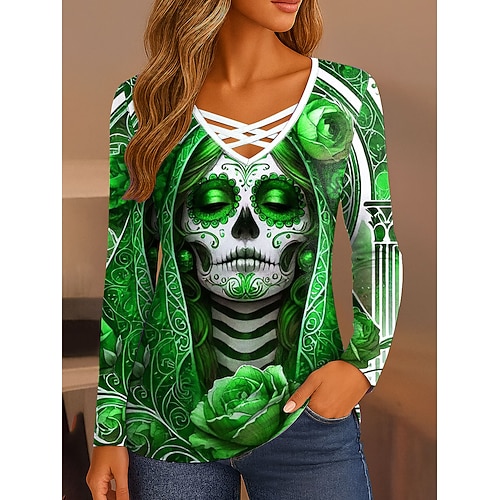 Maglietta da donna Teschi Grafica Vintage Stilosa Classica Manica Lunga Scollo a V Top Regolari Quotidiani Stampa Rossa Blu Viola Verde Grigia Primavera Autunno