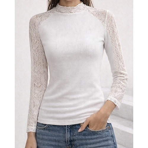 Per donna Top a maglia a coste Top con cuciture in pizzo T-shirt Raglan Patchwork Rete Tinta unica Elegante Vintage Manica Lunga Collo alto Top Regolari Quotidiano Uscire Bianco Estate Primavera