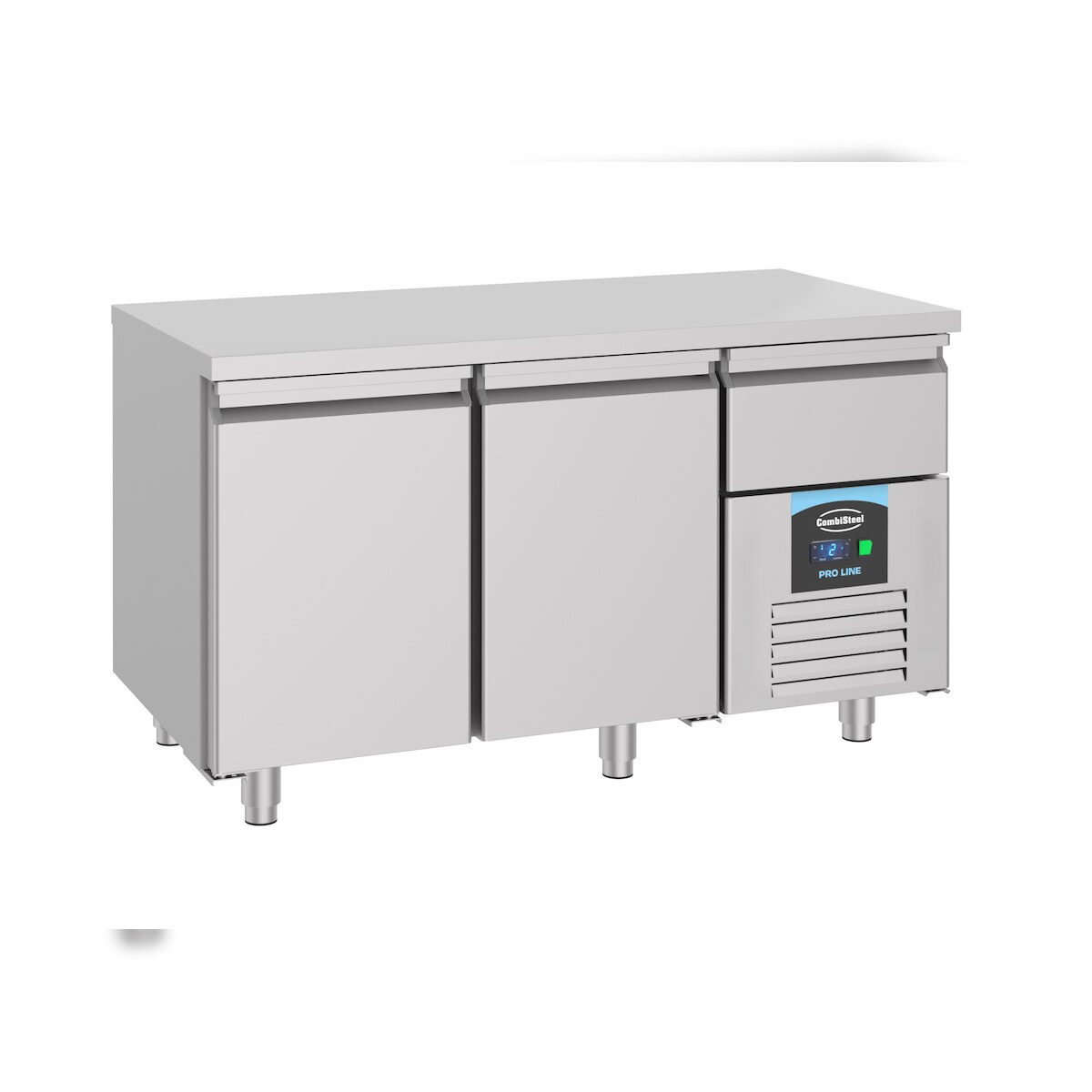 Kühltisch ANOLIS | 2x Tür & 1x gekühlte Schublade über dem Motor | 281 Liter, HxBxT 85x140x70cm | -2/+8°C | Edelstahl | + CHEFGASTRO Geschirrtuch