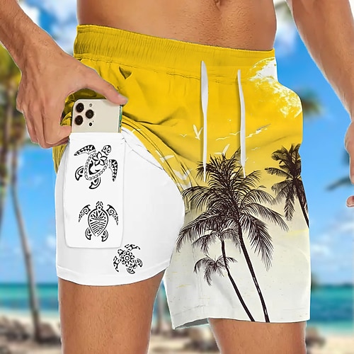 Per uomo Albero di Cocco Piante Tropicali Tartaruga di mare Pantaloncini foderati Pantaloncini da bagno 2 in 1 Pantaloncini da mare Misura del girovita medio Hawaiano Ferie Tasche Laterali Con Fodera