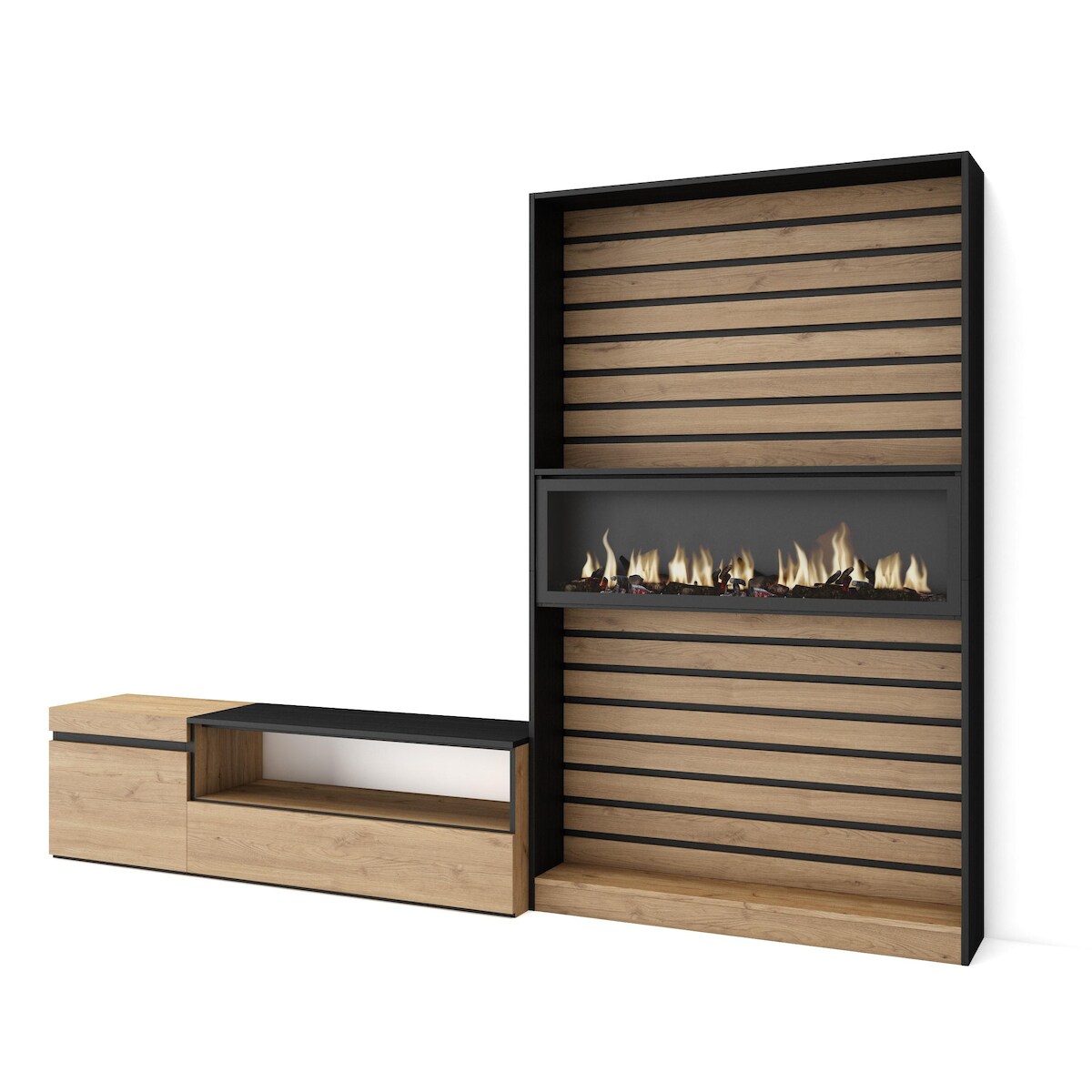 SKRAUT HOME Wohnzimmer-TV-Schrank, Wohnzimmer-Wandsystem, 260x35x186cm, Für TVs bis 65“, Elektrischer Kamin, Moderner Stil, Eiche und schwarz - 88_19