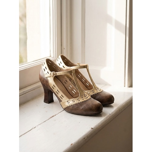 eleganti décolleté da donna con cinturino a T in oro e bianco - scarpe da sposa vintage con punta a coda di rondine e tacco a rocchetto per la madre della sposa, matrimoni al chiuso ed eventi formali da ballo