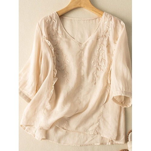 Per donna Camicia Blusa Finto cotone e lino Tinta unica Elegante Casual Manica 3/4 Girocollo Top Regolari Quotidiano Ricamato Bottoni Giallo Rosso Viola Verde Estate Primavera