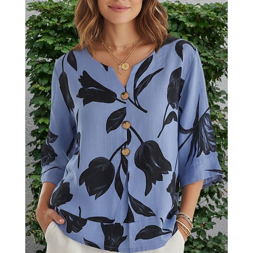 Per donna Camicia Finto cotone e lino Floreale Quotidiano Casual Manica 3/4 Girocollo Top Regolari Quotidiano Ferie Stampato Blu Bianco Giallo Rosso Estate Primavera Autunno