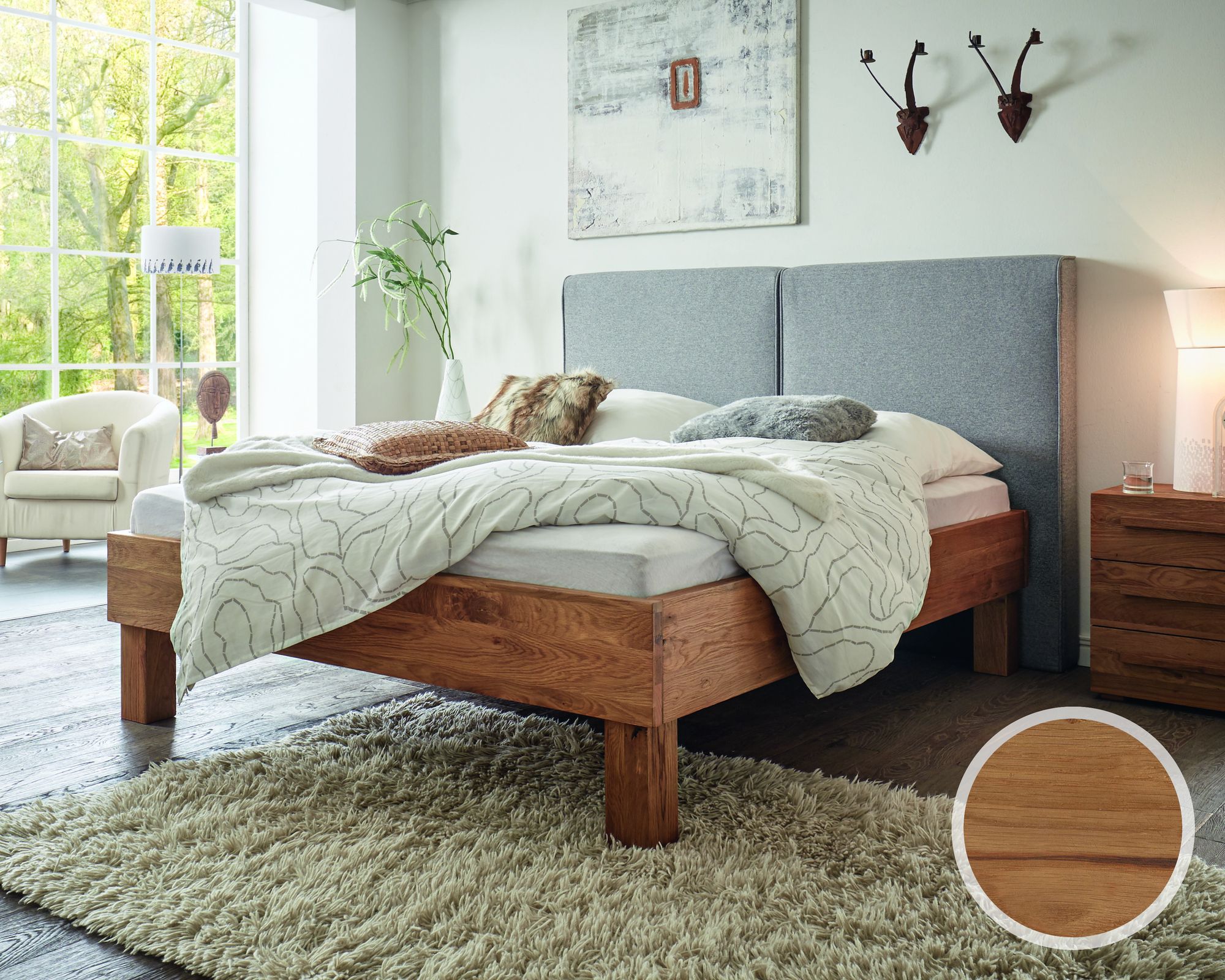 BlackWood »Nova Vita Contour IV« Wildeiche Massivholzbett 200x200 cm / Wildeiche rustic / Boucle Off-White