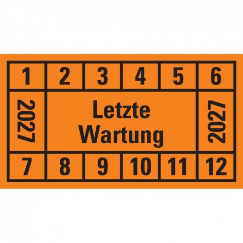 Dreifke® Prüfplakette Letzte Wartung 2027, orange, Dokumentenfolie, 45x25mm, 12 St/Bogen