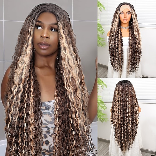 Parrucca in pizzo sintetico Ricci profondi Stile 32 pollice Ambra Riga centrale 13x4x1 T Parte Fronte in Pizzo Parrucca Per donna Parrucca Marrone chiaro / ramato