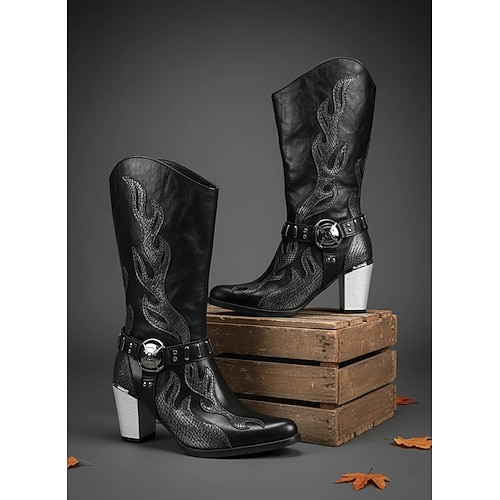 Stivali da cowboy western da donna con ricami a fiamma - stivali gotici neri e marroni con tacco grosso a metà polpaccio per Halloween, festival musicali e abiti da rodeo
