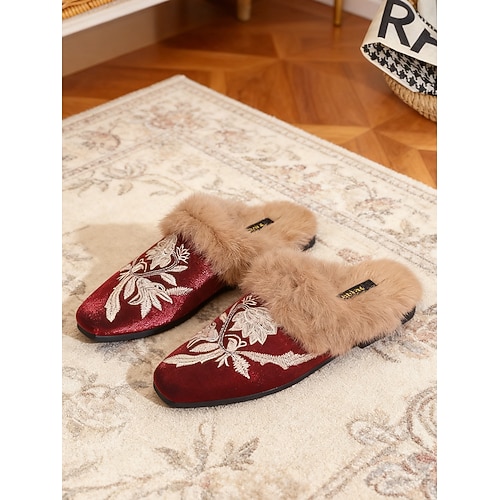 pantofole da donna con fodera in pelliccia ricamata rossa - design floreale in raso, comode pantofole slip-on per il comfort quotidiano, interno e invernale