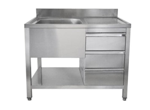 VM Europa Edelstahl Spültisch 1 Becken links, mit Grundboden, mit Aufkantung, 3 Schubalden rechts, Premium - alle Größen montiert: 120 x 60 cm / mit Aufkantu