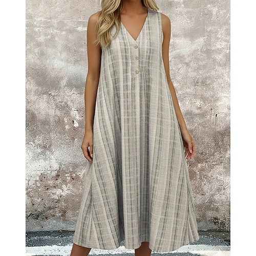 Per donna Abito Midi Abito in cotone e lino Moderno Quotidiano Vacanza Uscire Vestibilità comoda A righe Senza Maniche Scollo a V Blu Nero Rosa Viola Estate Primavera