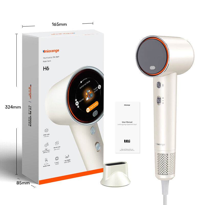 Uniorange H6, le sèche-cheveux haute vitesse à plasma (Blanc Lunaire), écran LCD HD, 5 modes intelligents, puissance 1600W et 1 milliard d’ions plasma, moteur à haute vitesse de 110 000 tr/min, sèche 5 fois plus vite