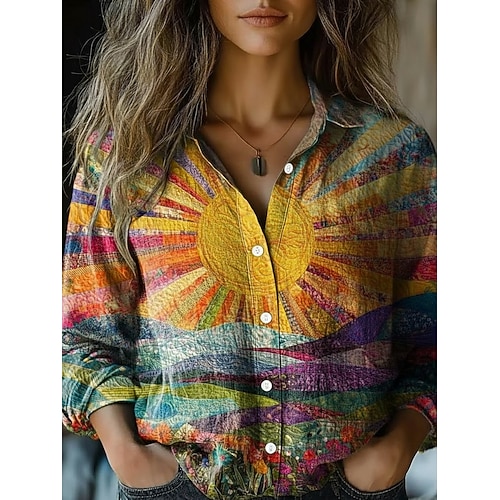 Per donna Camicia Finto cotone e lino Bottoni Stampato Sole Bohemien Vintage Elegante Manica Lunga Colletto a Camicia Top Regolari Quotidiano Ferie Blu Rosso Viola Fucsia Arancione Primavera Autunno
