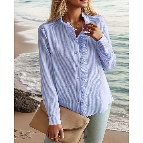 Per donna Camicia Blusa A righe Elegante Manica Lunga Collo Alto Top Regolari Ferie Uscire Arricciato Patchwork Bottoni Nero Bianco Rosa Blu Primavera Autunno