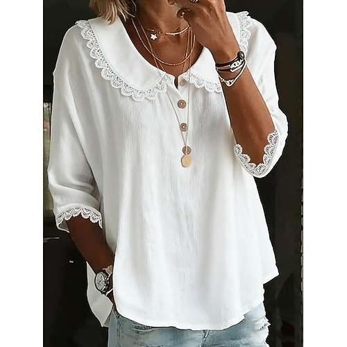 Per donna Blusa Tinta unica Elegante Casual Manica 3/4 Colletto a Camicia Top Regolari Quotidiano Bordo in pizzo Blu Bianco Giallo Rosa Estate Primavera Autunno