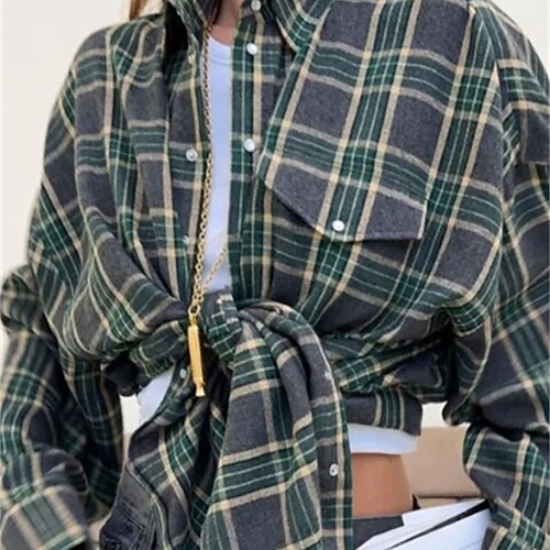 Per donna Camicia Blusa Plaid Semplice Elegante Vintage Classico Manica Lunga Colletto Polo Top Regolari Quotidiano Lavoro Ferie Arricciato Patchwork Tasca Verde primavera Nero Rosa Rosso Arancione