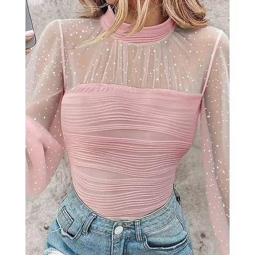 Per donna Camicia Blusa Semplice Elegante Manica Lunga Collo Alto Top Regolari Quotidiano Ferie Uscire Patchwork Rete Nero Bianco Rosa Estate Primavera
