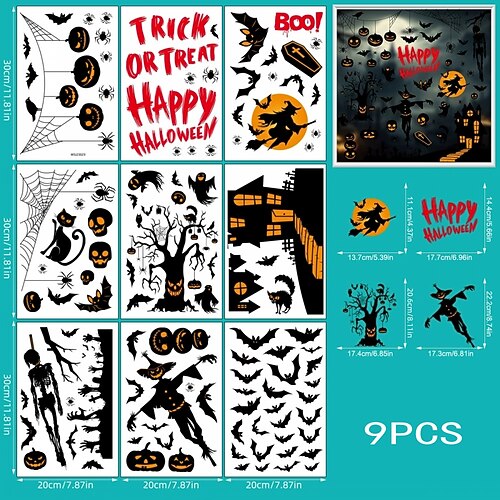 Set di 9 fogli di adesivi per finestre di Halloween: adesivi statici riutilizzabili con zucche, fantasmi, pipistrelli progetti di case infestate per decorazioni in vetro per feste natalizie