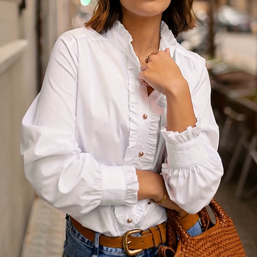 Per donna Camicia casual Camicia con Bottoni Blusa Volant Tinta unica Semplice Quotidiano Elegante Casual Manica Lunga Collo alla coreana Top Regolari Ferie Uscire Abbigliamento da vacanza Bianco