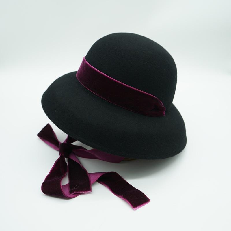 Vintage Hepburn Elegant Velvet Lace-Up Bell Shaped Black Woolen Basin Top Hat Female Autumn And Winter Fisherman British Foreign Trade 56-58cm