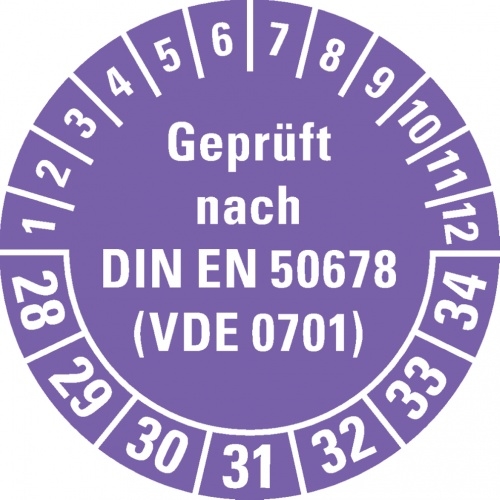 Dreifke® Prüfplakette Gepr.n.DIN EN 50678(VDE 0701) 28-34, violett, Doku.folie, Ø30mm, 108 Stk.