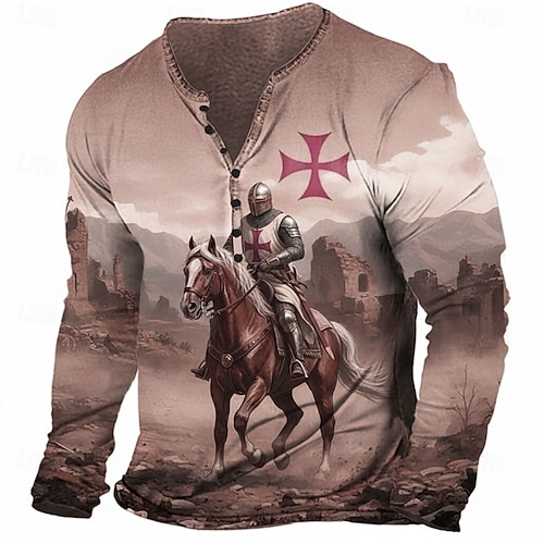 Per uomo Grafico Cavalieri Templari Maglietta Maglia Henley Manica Lunga Vintage Designer Elegante All'aperto Casuale Quotidiano Primavera Primavera Estate Marrone Rosso Blu Henley Maglietta Henley